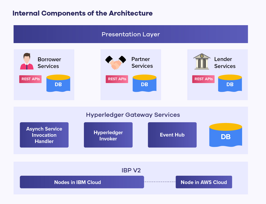 We followed a modular microservices architecture. The complexity of interaction with the blockchain itself is abstracted out to a generic component that knows how to invoke chaincode to read/write data from/to the blockchain. This helps to keep the other services lightweight and flexible.