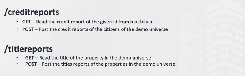 1. The Credit Reporting Agency — publishes the credit report of the citizens of the demo universe to the blockchain network. Controls access to the reports through smart contracts.